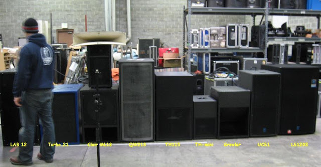 These guys were quite impressive! They are the size of a small trash can, but can keep up with the turbosound 21's! They had a VERY smooth sound, and put out a ton of sound for their size. They had a noticeable drop in the low reign, but it should be expected for their size. They kept right up with the Growlers in terms of output, but the growlers had a little more bottom end to them. I gave them a solid 10 on size to output ratio, as it was very impressive. They got a "7" overall, and would be great for band PA systems. I didnt get a chance to meter them with the dB meter, but I was pretty impressed over all.