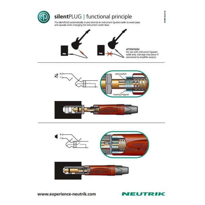 igor47, Нойтрик Сайлент Плаг внутри имеет геркон, а на никелированом подпружиненом кольце магнит. При подключении такого Джека кольцо утапливается в корпус разъема и геркон, замыкающий по умолчанию горячий конец на экран оказывается разомкнут. И наоборот. Соответственн бабаха в динамиках не происходит