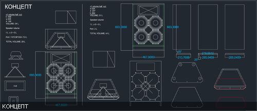Посмотри проекты Eminence, обрати внимание в первом проекте на Vb = 0.28 cu.ft = 7,9 литра (полезный объём) и полный объём V(total) = 0.317 cu.ft = 8,97 литра. И это под одну голову. Плюс объём драйвера и рупора. Прикинь габариты для четырёх голов. Такие габариты обусловлены в том числе достаточно высокой добротностью головок.